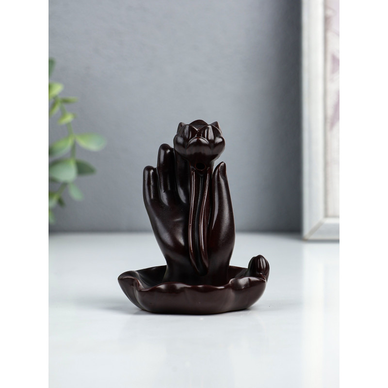 Подставка выполнена в форме руки с лотосом, что придает ей особый шарм и символику.
