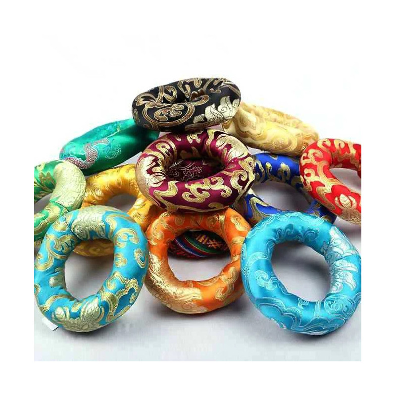 Подушки для поющих чаш бывают двух вариантов: цельные и бублик. Эти круглые подушки-подставки разного диаметра подойдут для чаш практически любого размера. Прекрасно смотрятся в интерьере, а также используются в медитативных практиках.