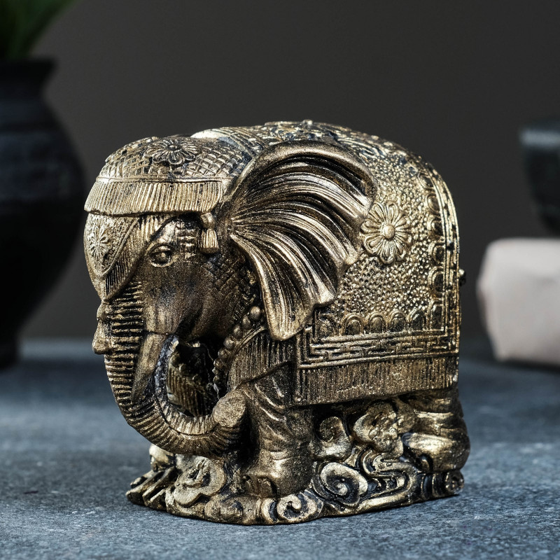 Фигурка гипс «Индийский слон» в старом золоте станет великолепным акцентом любого интерьера, добавляя уют и стиль в ваше пространство. Эта элегантная статуэтка размером 12×7×6 см выполнена из качественного гипса, что обеспечивает долговечность и сохранение блеска благодаря лакокрасочному покрытию.