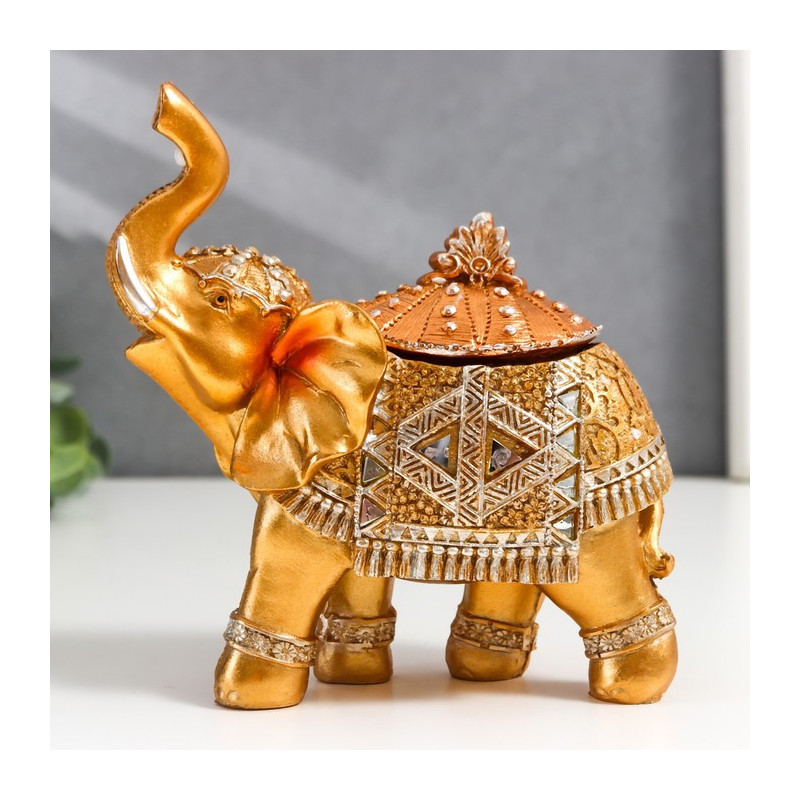 Элегантное сочетание восточного колорита и практичности — перед вами изысканная шкатулка в форме слона, которая станет не просто хранилищем для украшений, а настоящим украшением интерьера. Отполированная до зеркального блеска попона и золотистый оттенок придают изделию благородный вид, а прочный полистоун гарантирует долговечность.