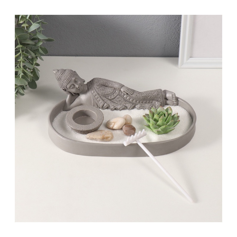 Погрузитесь в атмосферу спокойствия и гармонии с миниатюрным настольным садом в стиле Дзен. Эта композиция сочетает символы японской философии с изображением лежащего Будды, создавая пространство для медитации и размышлений.