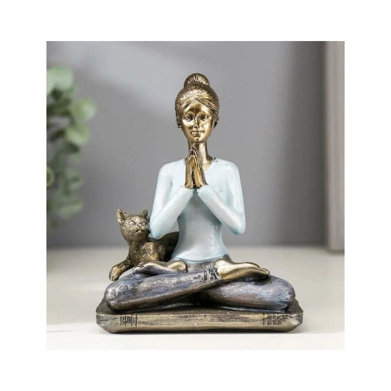Фигурка полистоун "Девушка в позе лотоса, с котом" станет стильным акцентом в вашем интерьере. Изделие выполнено из качественного полистоуна и окрашено в синюю и бронзовую гамму, что придает ему уникальность и элегантность.